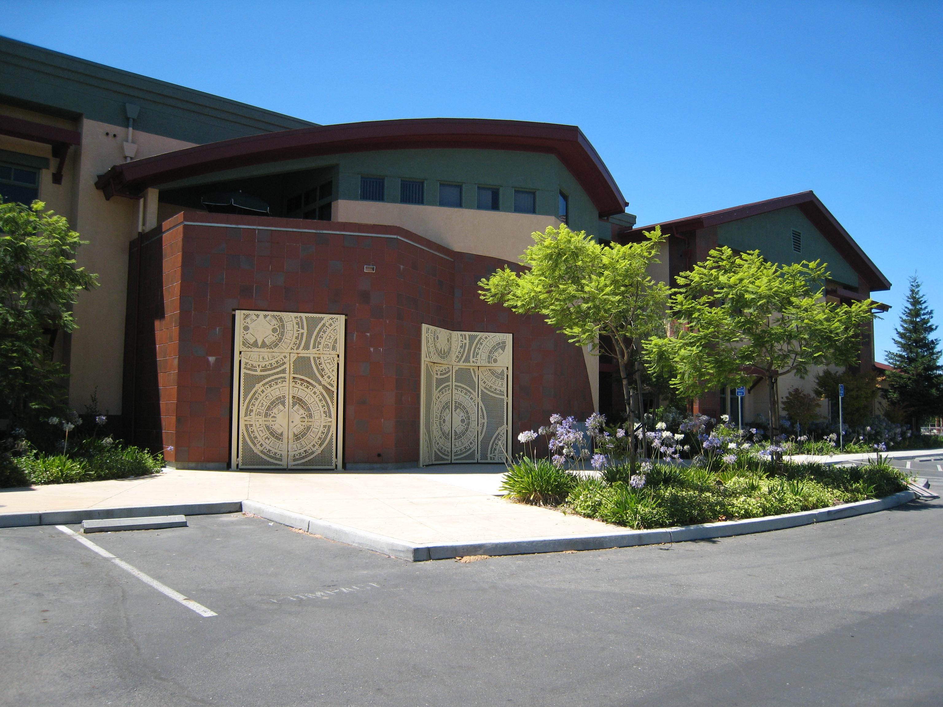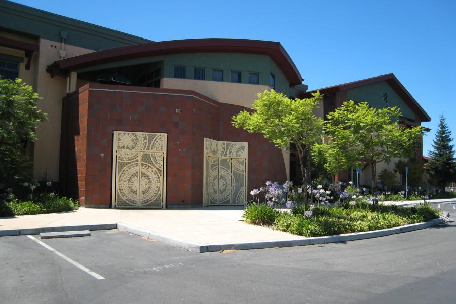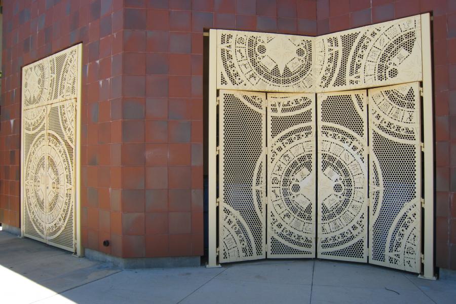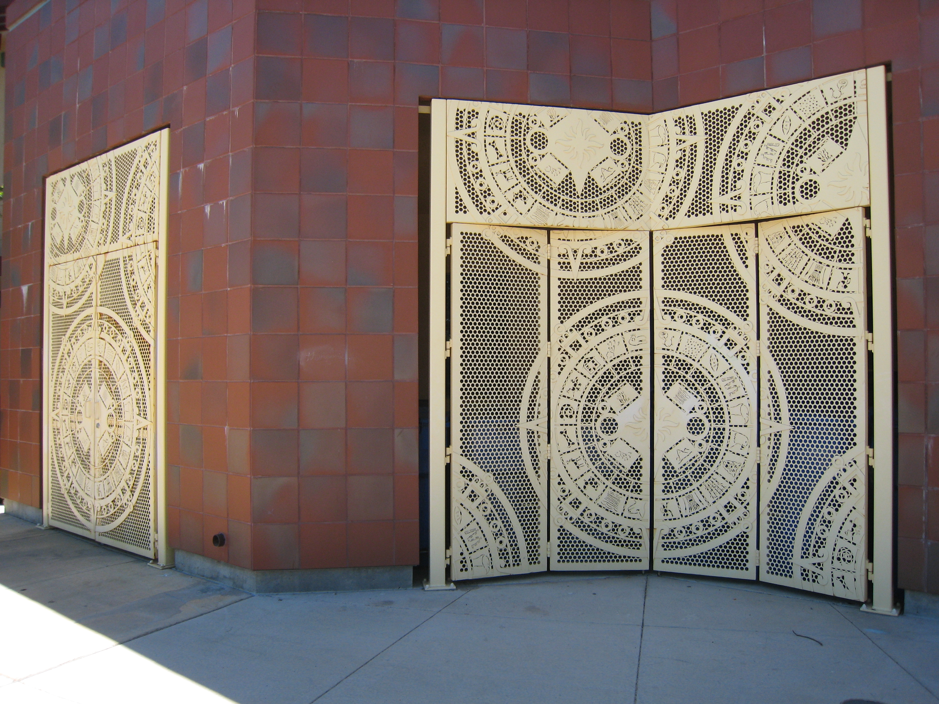 The two gates that cover the Teacher’s entrance, which was needed to secure a private entrance, combine beauty and interest with functionality. The image of the Aztec Calendar was chosen based on the school’s namesake, Ernesto Galarza. The design, “Cycles of Time” is a circular design that used decorative elements from this famous Mexican artifact. Students re-created glyphs of the twenty-day signs of the 260-day calendar with images of a rabbit, monkey, jaguar, dog, deer, lizard, etc. Their black and white line drawings were translated into cut metal via the water-jet process.